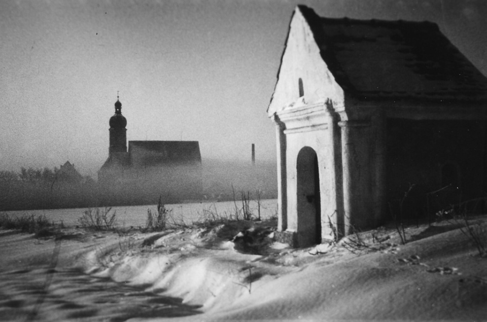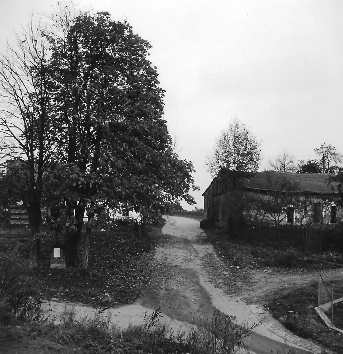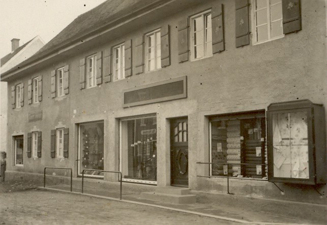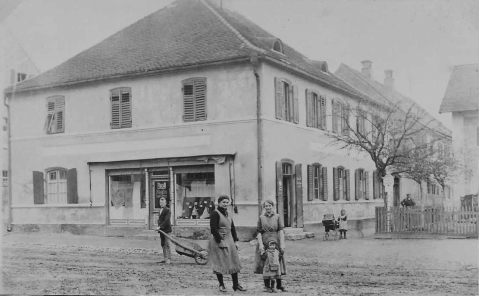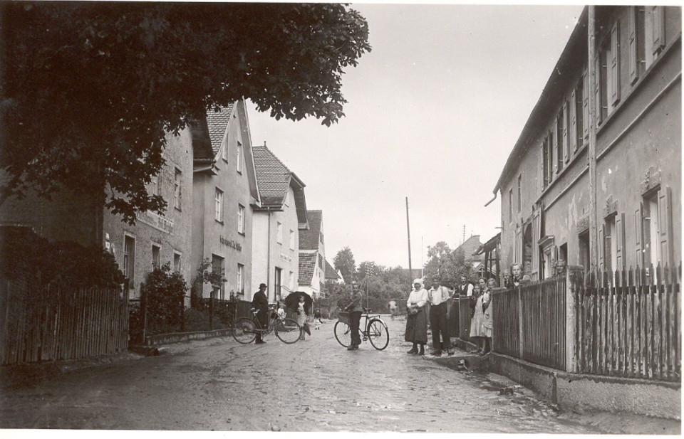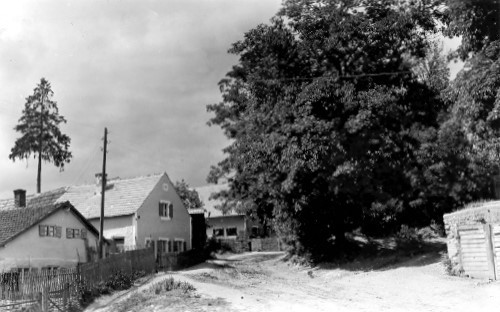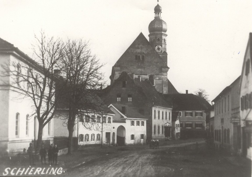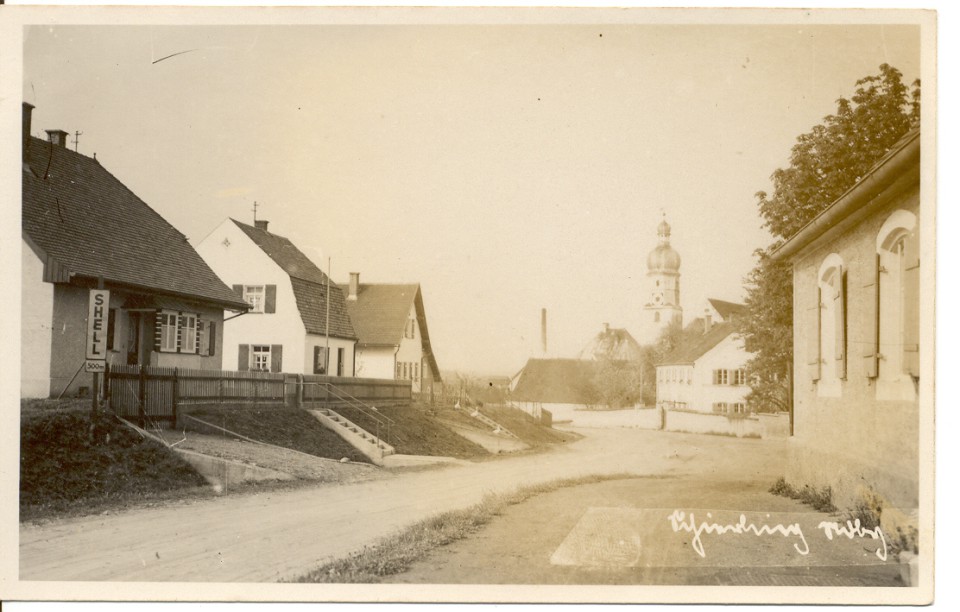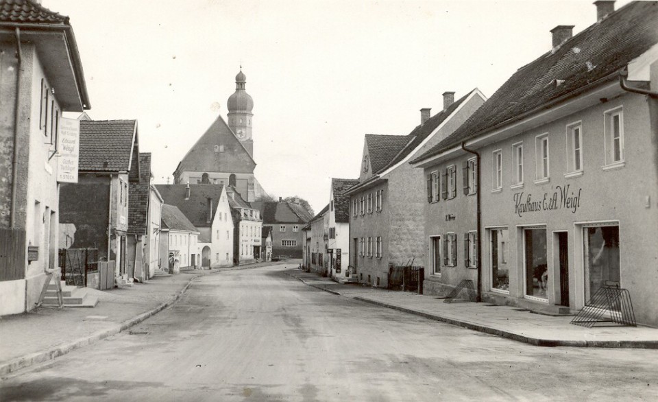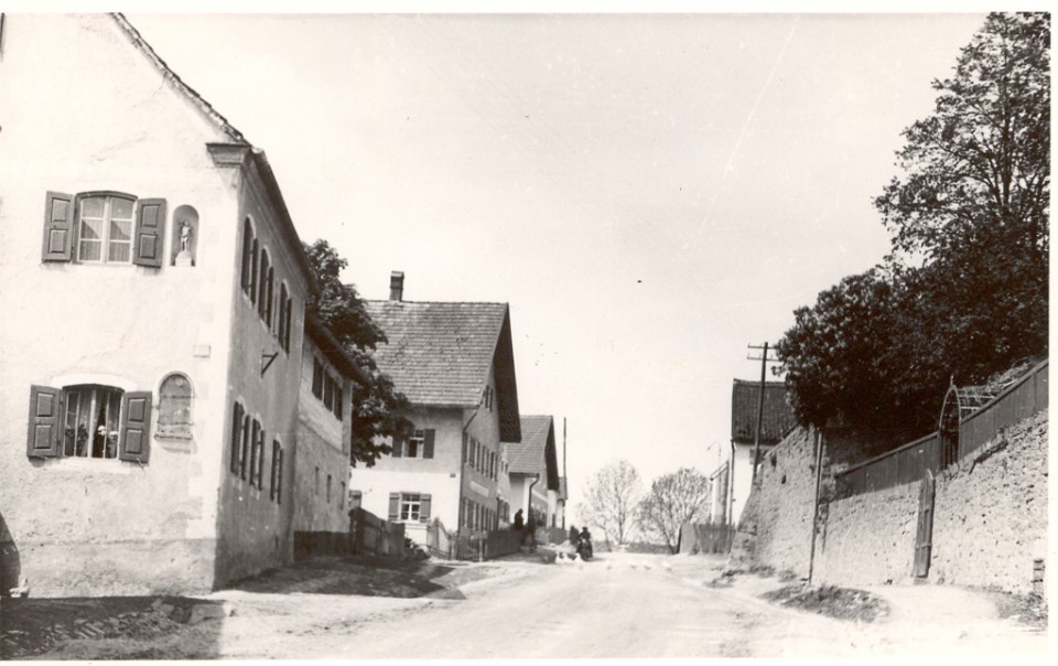 Jakob Brand Straße in Richtung Ortsmitte. Das Gebäude rechts war das Spital, erbaut 1874 durch Pfarrer Dr. Jakob Brand.
