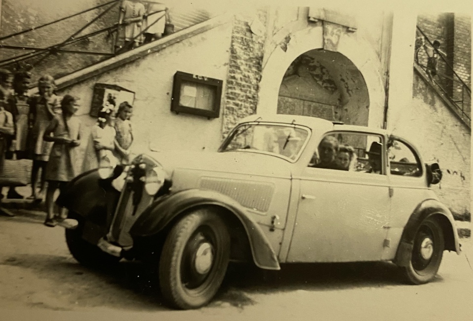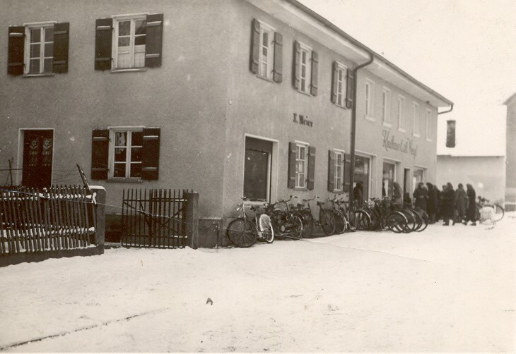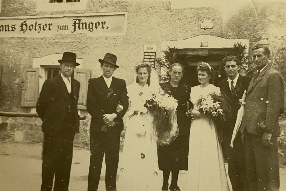 Hochzeitbild 1947 von Völkl Ludwig und Anna Hüttenkofer vorm Gasthaus Hans Holzer zum Anger.