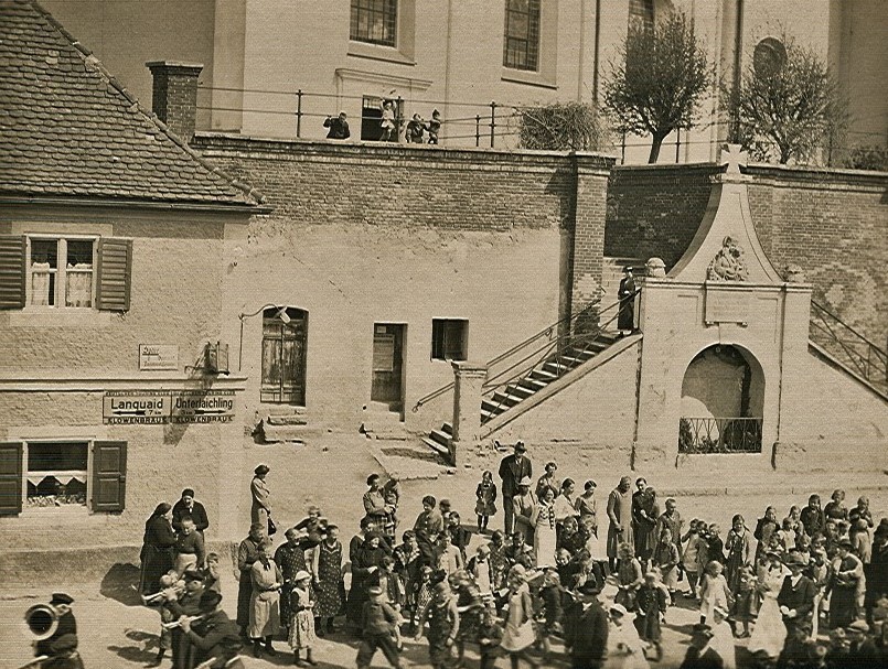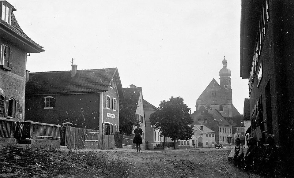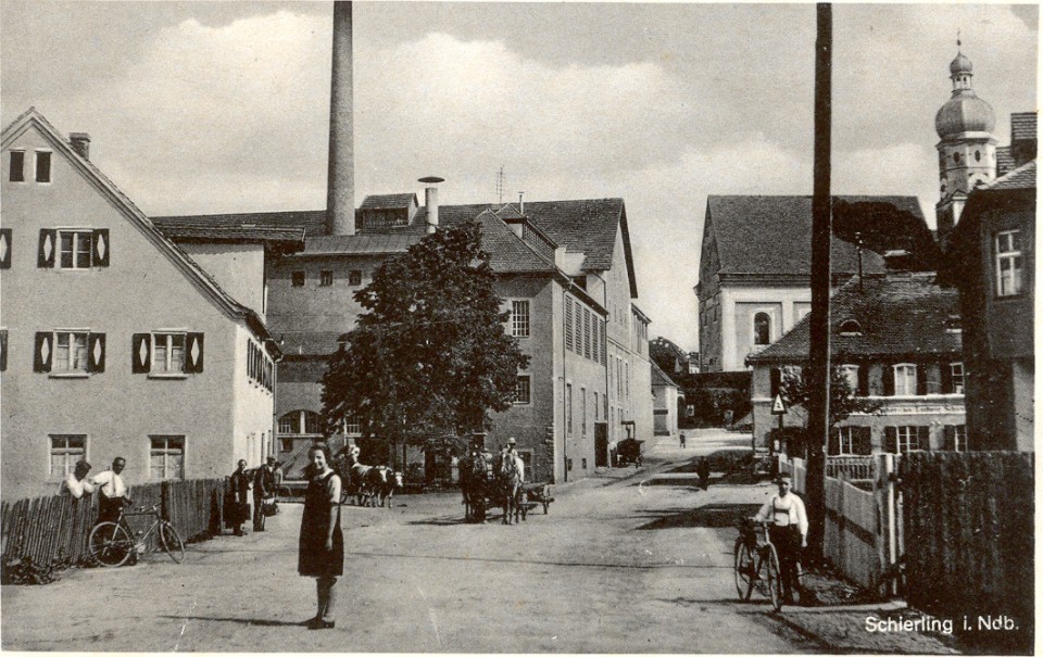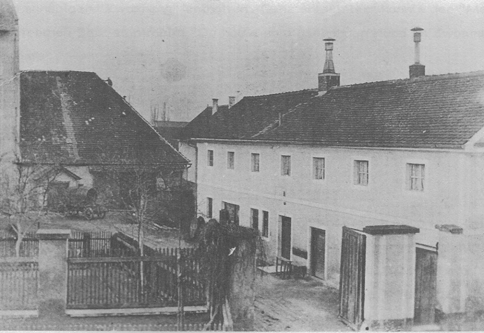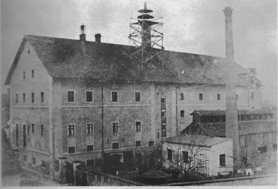 Hauptgebäude der Brauerei um 1900. Fotografiert wurde das Gebäude von der Kirche aus. Die Mauer im Bild unten gibt den heutigen Verlauf der Brauereigebäude wieder.