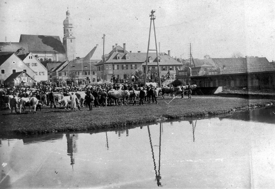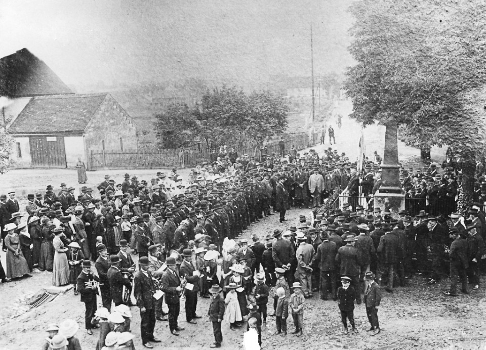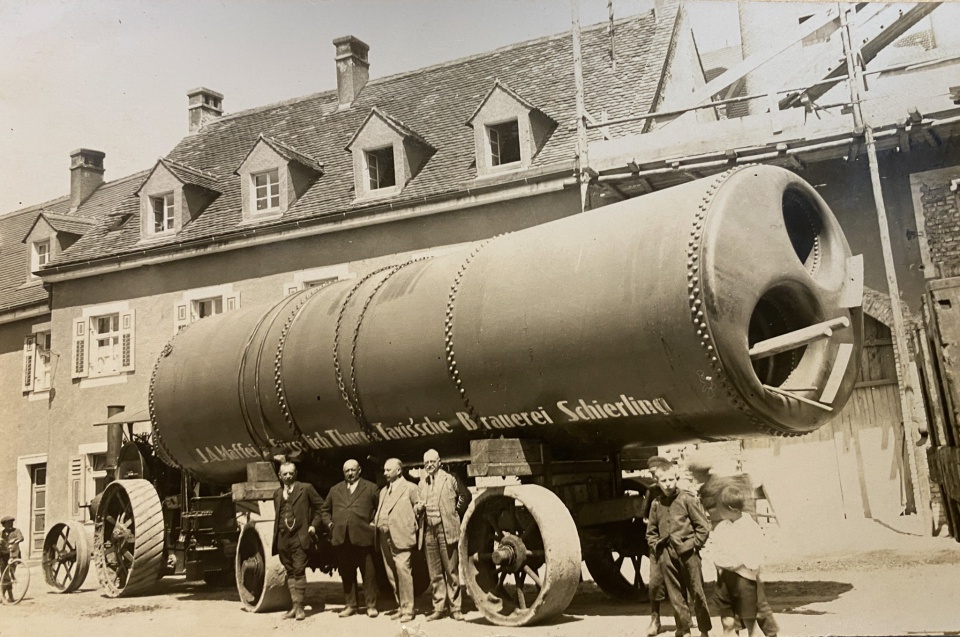 Die Brauerei erhält einen neuen Kessel über dem das Brauwasser erhitzt wird. Aufnahme ca. 1910 vor dem Bräustüberl.